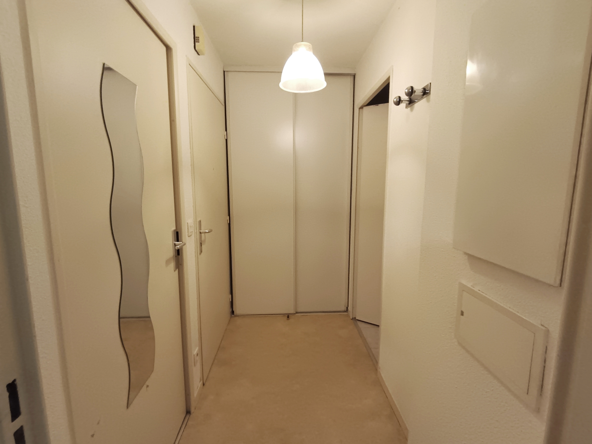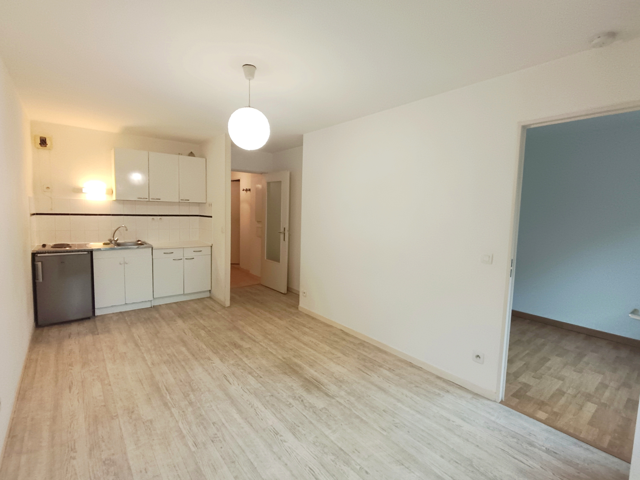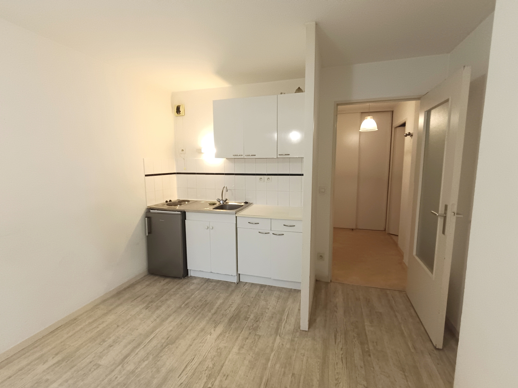 Appartement de type 1bis comprenant une entrée avec placard, un wc, une salle de bains, une kitchenette aménagée et équipée (frigo, plaques) ouverte sur la partie séjour de 15.42m2, et un coin nuit de 8.12m2 (avec une porte).