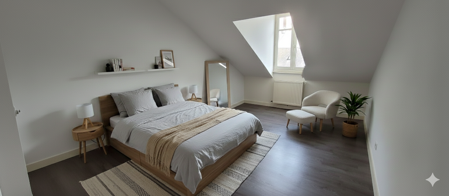 Le premier niveau se compose d'une entrée, d'un séjour lumineux, d'une cuisine équipée avec placard, d'une chambre, ainsi que d'une salle de bains avec baignoire et de WC séparés. À l'étage, un couloir dessert deux chambres supplémentaires.