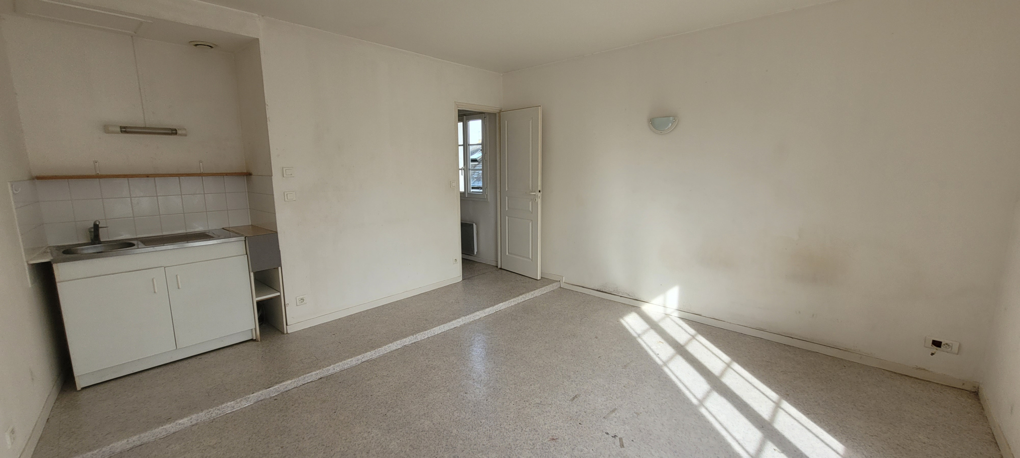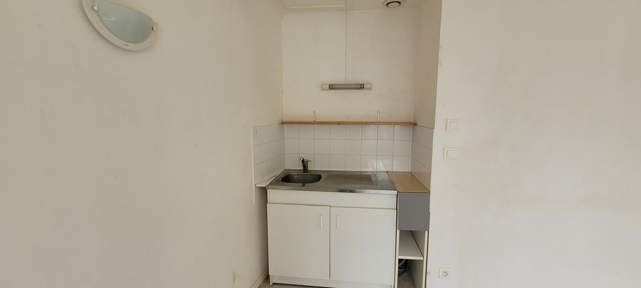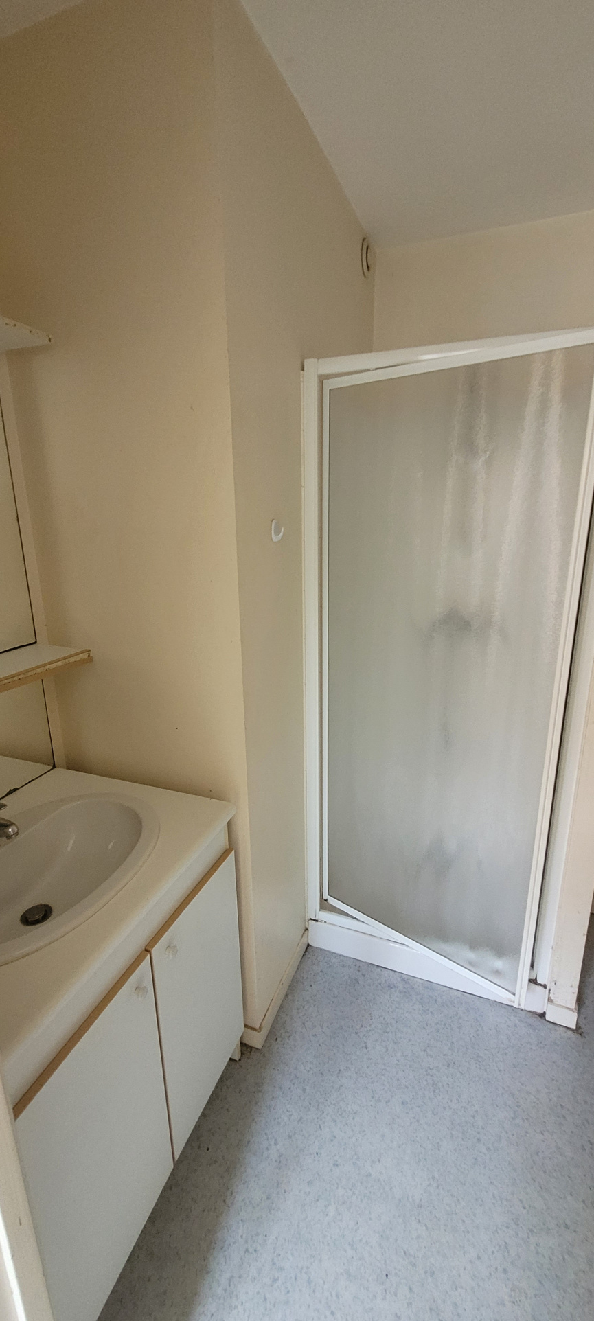 Au calme d'une petite résidence - Au 3e étage (sans ascenseur), appartement T1 comprenant une entrée avec placard (penderie), une pièce de vie avec coin cuisine et une salle d'eau (douche) avec wc.
