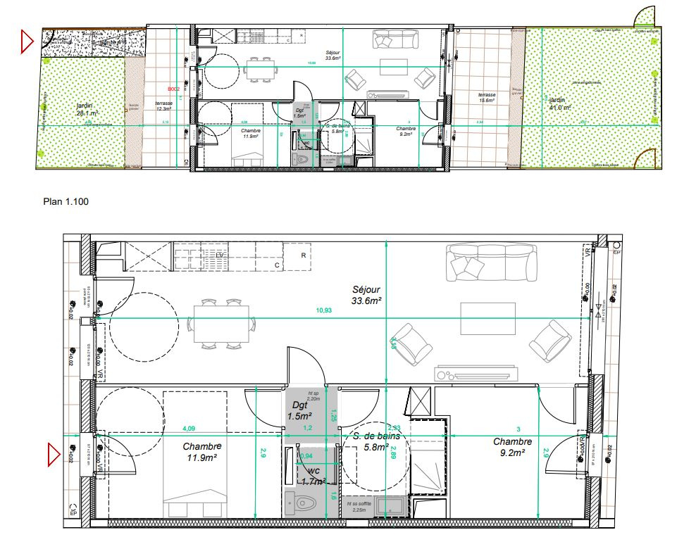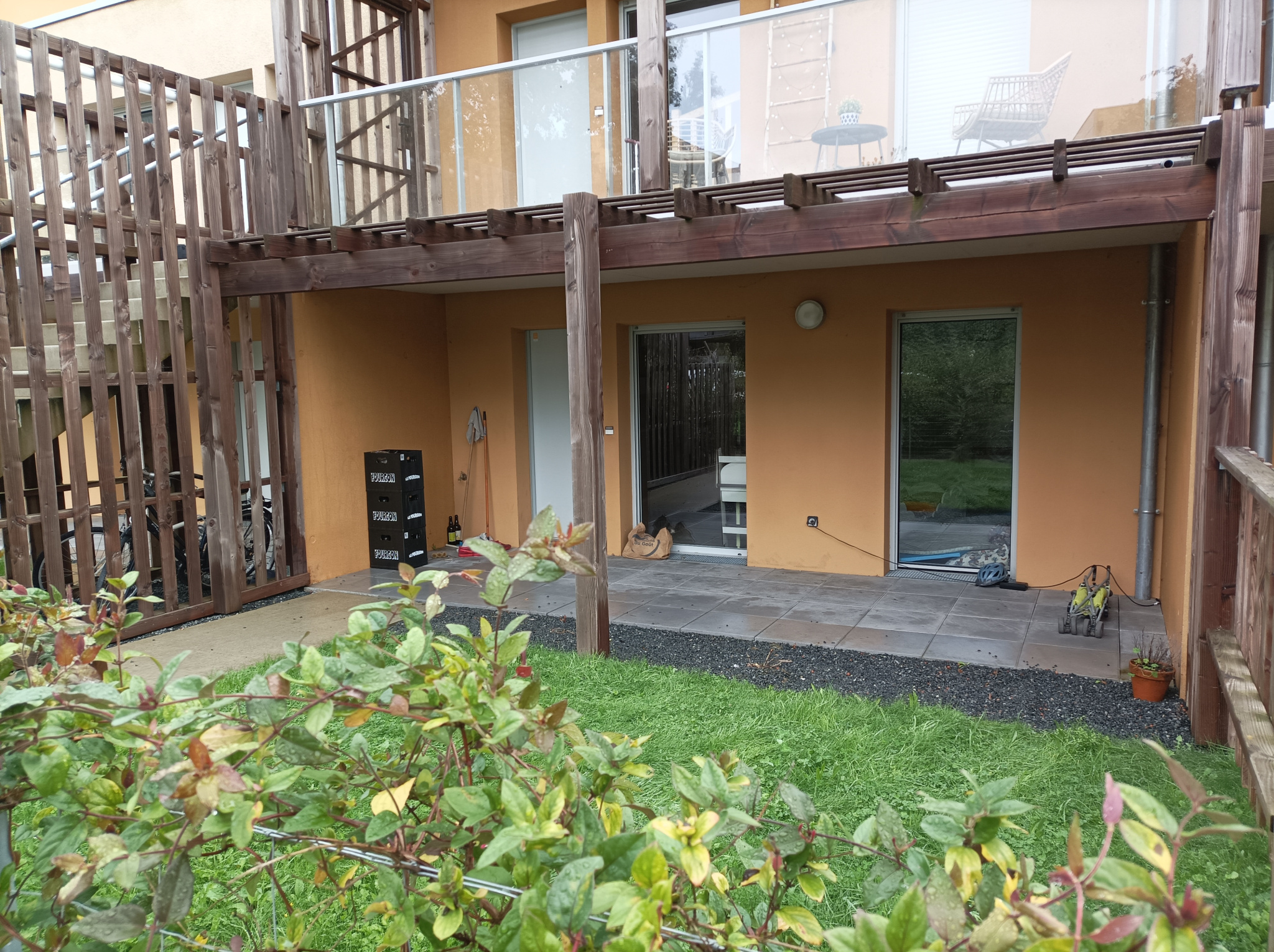 Dans une résidence récente, accessible directement par le jardin, un appartement T3 en rez-de-jardin de 63m2 comprenant deux jardins et deux terrasses (à l'avant et à l'arrière du logement), un séjour avec coin cuisine aménagé, deux chambres, une salle d'eau (douche) et un WC séparé. Un emplacement de stationnement au sous-sol de la résidence.