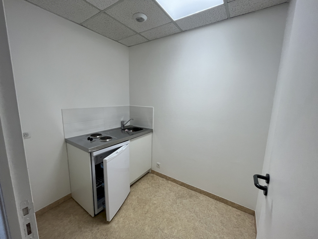 Comprenant une entrée, trois bureaux, des toilettes, un coin cuisine (réfrigérateur, plaques) et un local technique.