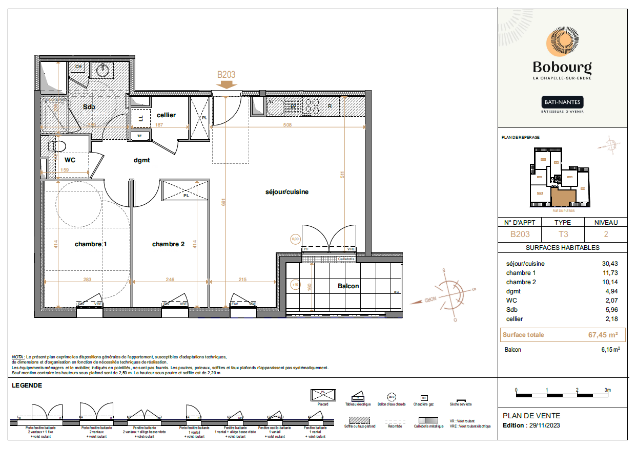 Situé au 2ème étage du bâtiment B au sein de la résidence récente Bobourg, en plein coeur de La Chapelle-sur-Erdre, cet appartement de type 3 (noB203) bénéficie d'un environnement à la fois central et verdoyant.