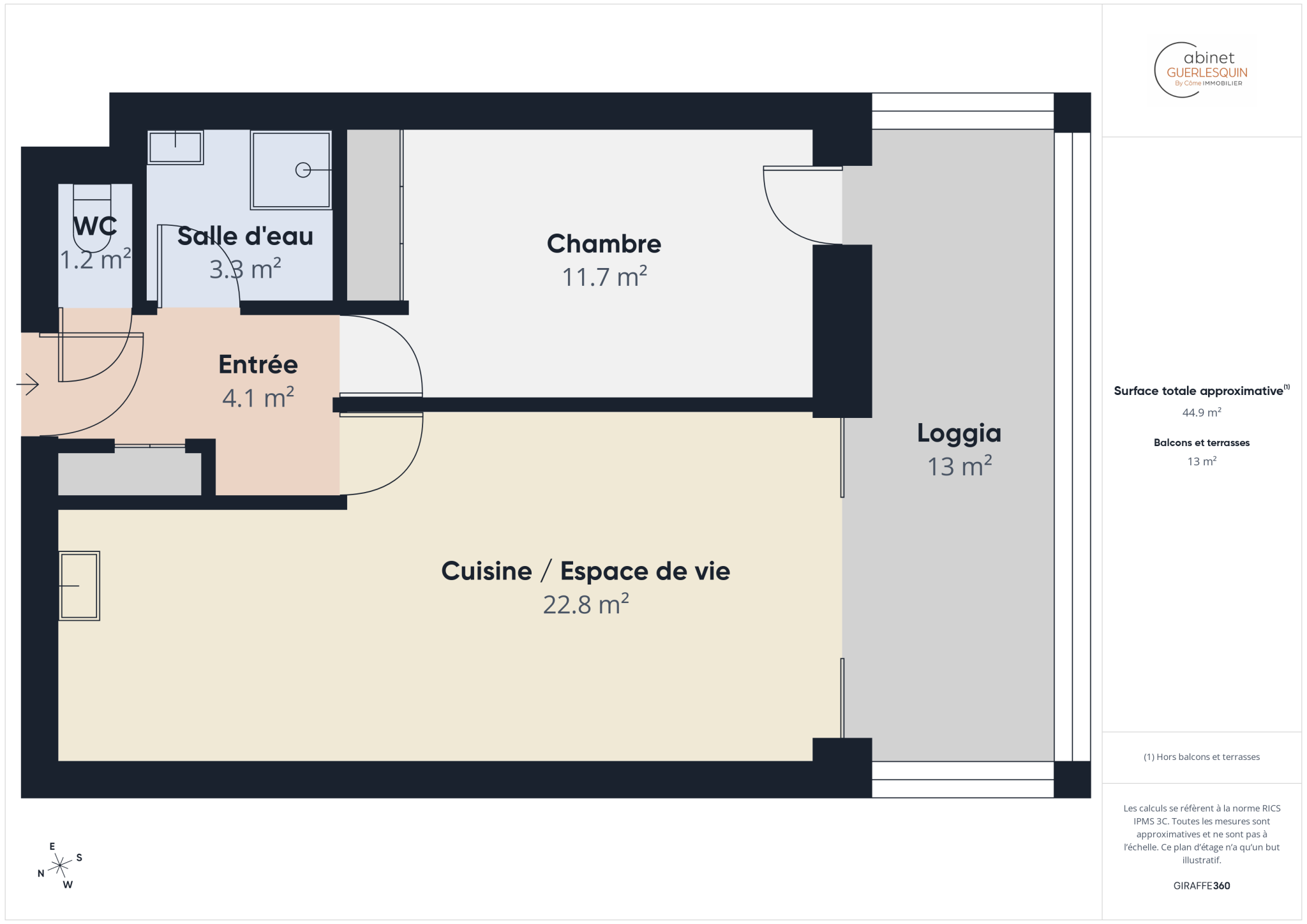 Il se compose d'une grande entrée avec placards, un séjour lumineux avec un accès à une loggia, une chambre avec placard, une salle d'eau et des WC séparés.