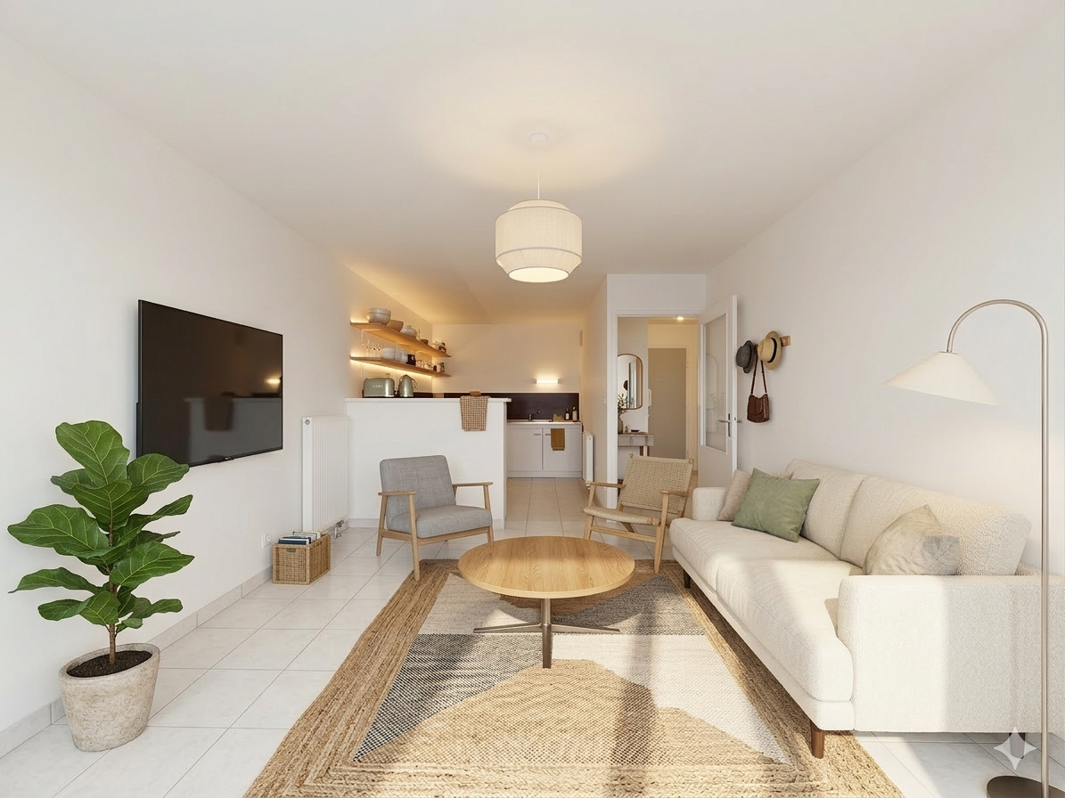 Il se compose d'une grande entrée avec placards, un séjour lumineux avec un accès à une loggia, une chambre avec placard, une salle d'eau et des WC séparés.
