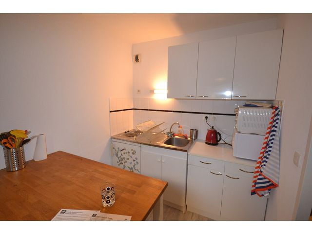 Appartement de type 1bis comprenant une entrée avec placard, un wc, une salle de bains, une kitchenette aménagée et équipée (frigo, plaques) ouverte sur la partie séjour, et un coin nuit (avec une porte).